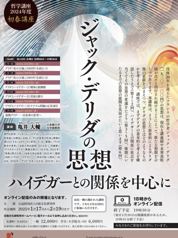 [開催終了] 哲学講座(2024初春)「ジャック・デリダの思想——ハイデガーとの関係を中心に」