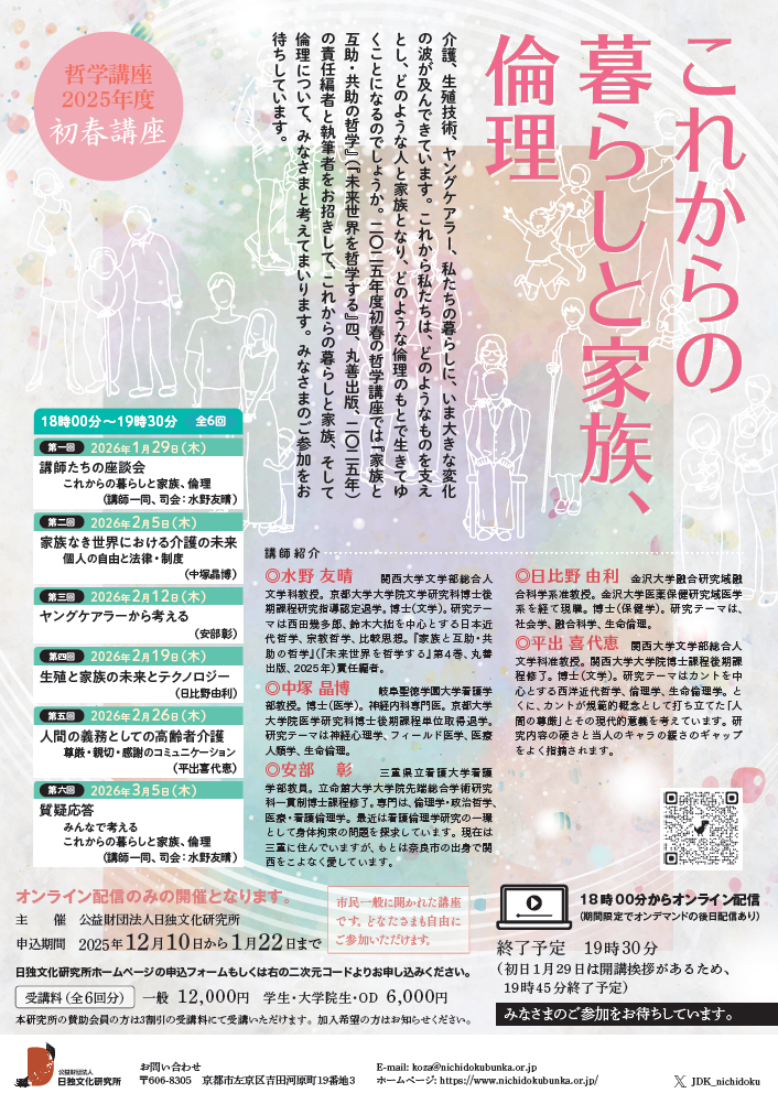 介護、生殖技術、ヤングケアラー、私たちの暮らしに、いま大きな変化の波が及んできています。これから私たちは、どのようなものを支えとし、どのような人と家族となり、どのような倫理のもとで生きてゆくことになるのでしょうか。2025年度初春の哲学講座では『家族と互助・共助の哲学』(『未来世界を哲学する』4、丸善出版、2025年)の責任編者と執筆者をお招きして、これからの暮らしと家族、そして倫理について、みなさまと考えてまいります。みなさまのご参加をお待ちしています。